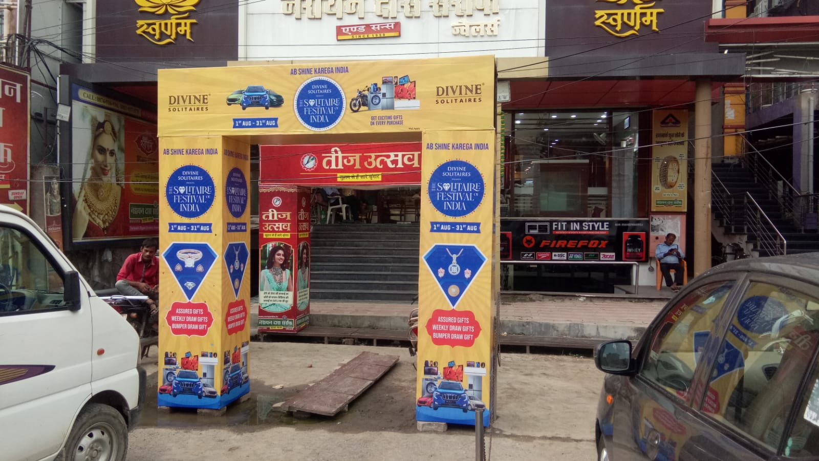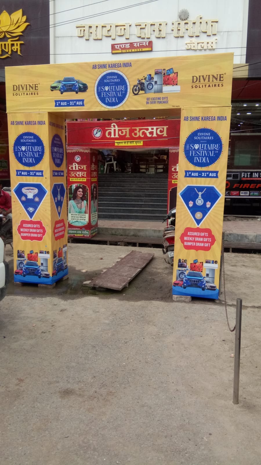 An Arch Gate Advertisement is a large decorative entry gate structure created for brand promotion, usually placed at event entrances, road crossings, marketplaces, exhibitions, melas, or shop openings. It is designed to look like an “entry arch” with branding printed on it.